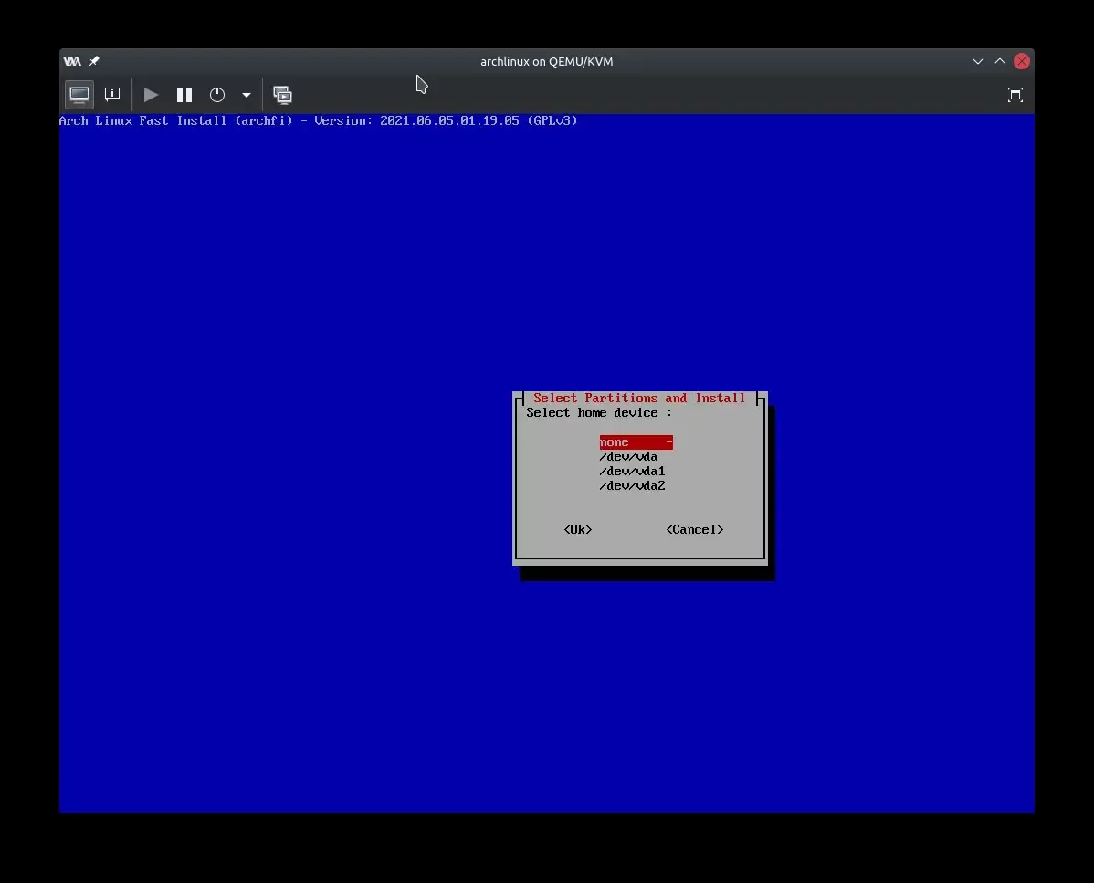Као и код стандардне инсталације, започиње се одабиром језика, распореда тастатуре и партиционисањем уређаја и монтирањем партиција на који ће бити инсталиран нови систем. У овом примеру се ради о ГПТ систему са ЕФИ системском партицијом (што је случај са свим рачунарима купљеним у последих 10ак година).