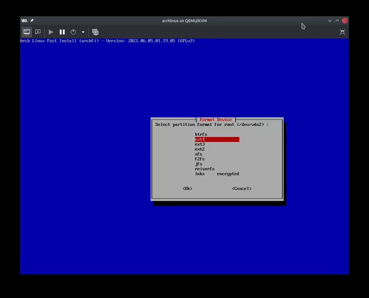 Као и код стандардне инсталације, започиње се одабиром језика, распореда тастатуре и партиционисањем уређаја и монтирањем партиција на који ће бити инсталиран нови систем. У овом примеру се ради о ГПТ систему са ЕФИ системском партицијом (што је случај са свим рачунарима купљеним у последих 10ак година).