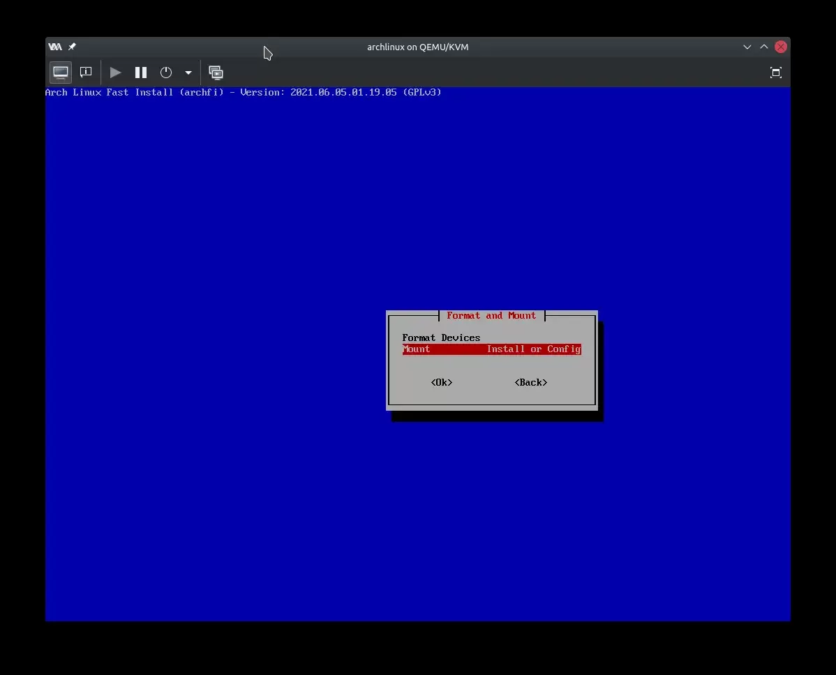Као и код стандардне инсталације, започиње се одабиром језика, распореда тастатуре и партиционисањем уређаја и монтирањем партиција на који ће бити инсталиран нови систем. У овом примеру се ради о ГПТ систему са ЕФИ системском партицијом (што је случај са свим рачунарима купљеним у последих 10ак година).