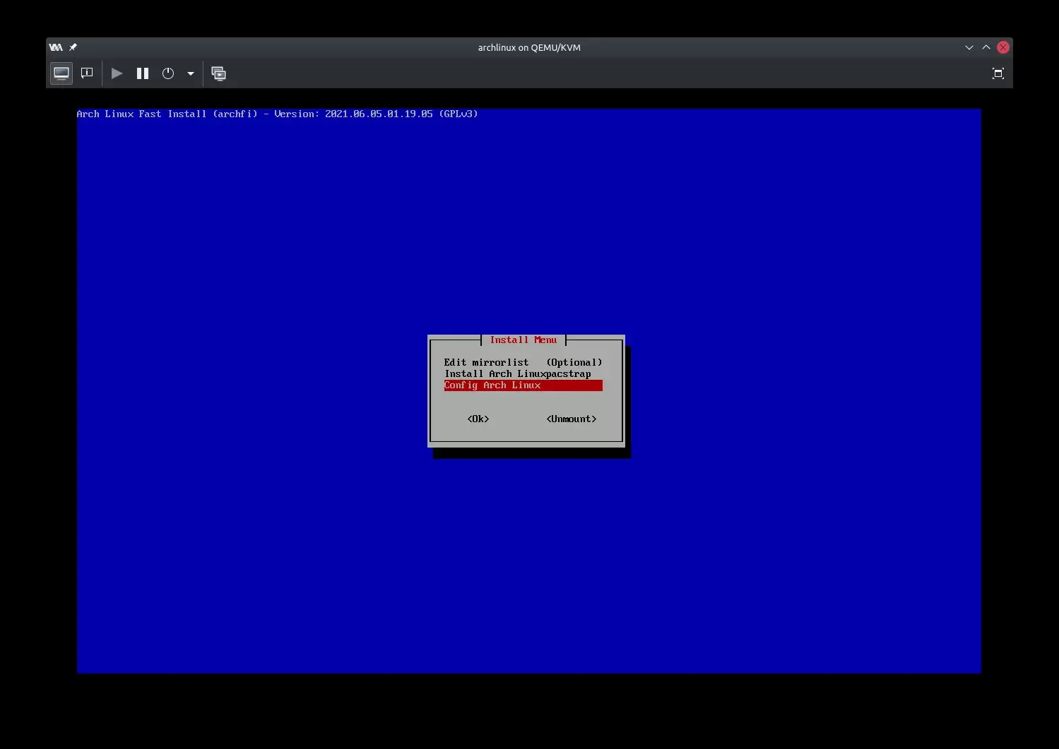 Следи покретање инсталације основног система pacstrap алатом и одабир кернела који ће бити преузет и коришћен на инсталираном систему. Иза тога се прелази на следећу област – конфигурисање нове инсталације.
