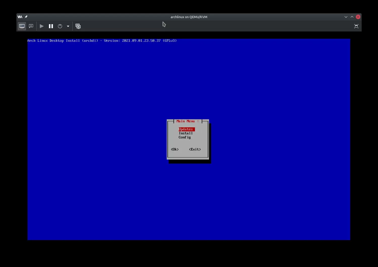 Рад АрчФи скрипте овде престаје, јер за инсталацију графичког окружења је неопходна друга скрипта са именом Archdi. Арчди скрипта има једноставнији главни мени са само три ставке, као на наредној слици:
