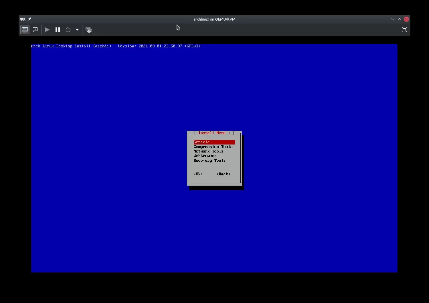 Рад АрчФи скрипте овде престаје, јер за инсталацију графичког окружења је неопходна друга скрипта са именом Archdi. Арчди скрипта има једноставнији главни мени са само три ставке, као на наредној слици: