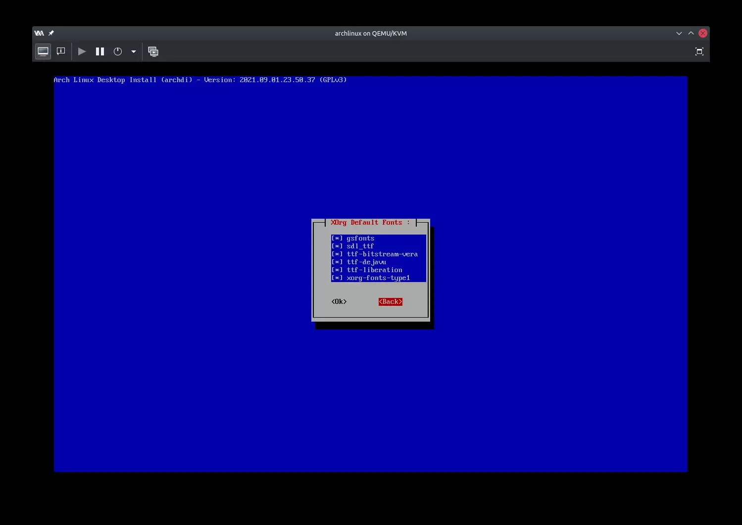 Рад АрчФи скрипте овде престаје, јер за инсталацију графичког окружења је неопходна друга скрипта са именом Archdi. Арчди скрипта има једноставнији главни мени са само три ставке, као на наредној слици:
