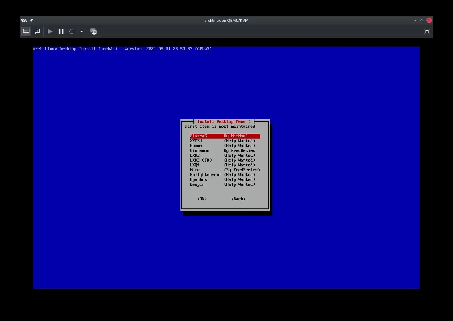 Други део овог корака обухвата постављање лозинке за „рут“ корисника и генерисање fstab датотеке са UUID бројевима партиција. Ово је стандар толико дуго да се ни не сећам када је почео да се користи :). У овом кораку не мењам датотеке mkinitcpio или mirrorlist. Након избора одговарајућег бутлоадера, прелази се на наредни корак у инсталацији, а то је инсталација графичког окружења. За бутлоадер сам од недавно почео да користим systemd-boot. Разлог за то је брже подизање система коришћењем овог бутлоадера у односу на Груб2 и једна надоградња Груба ми је онемогућила подизање система.