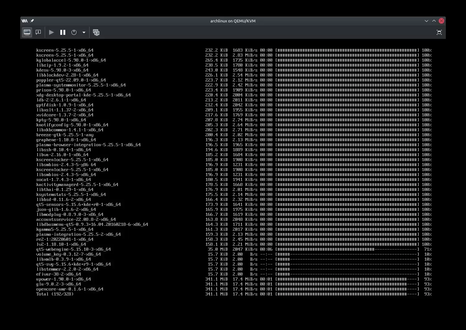 Следи покретање инсталације основног система pacstrap алатом и одабир кернела који ће бити преузет и коришћен на инсталираном систему. Иза тога се прелази на следећу област – конфигурисање нове инсталације.