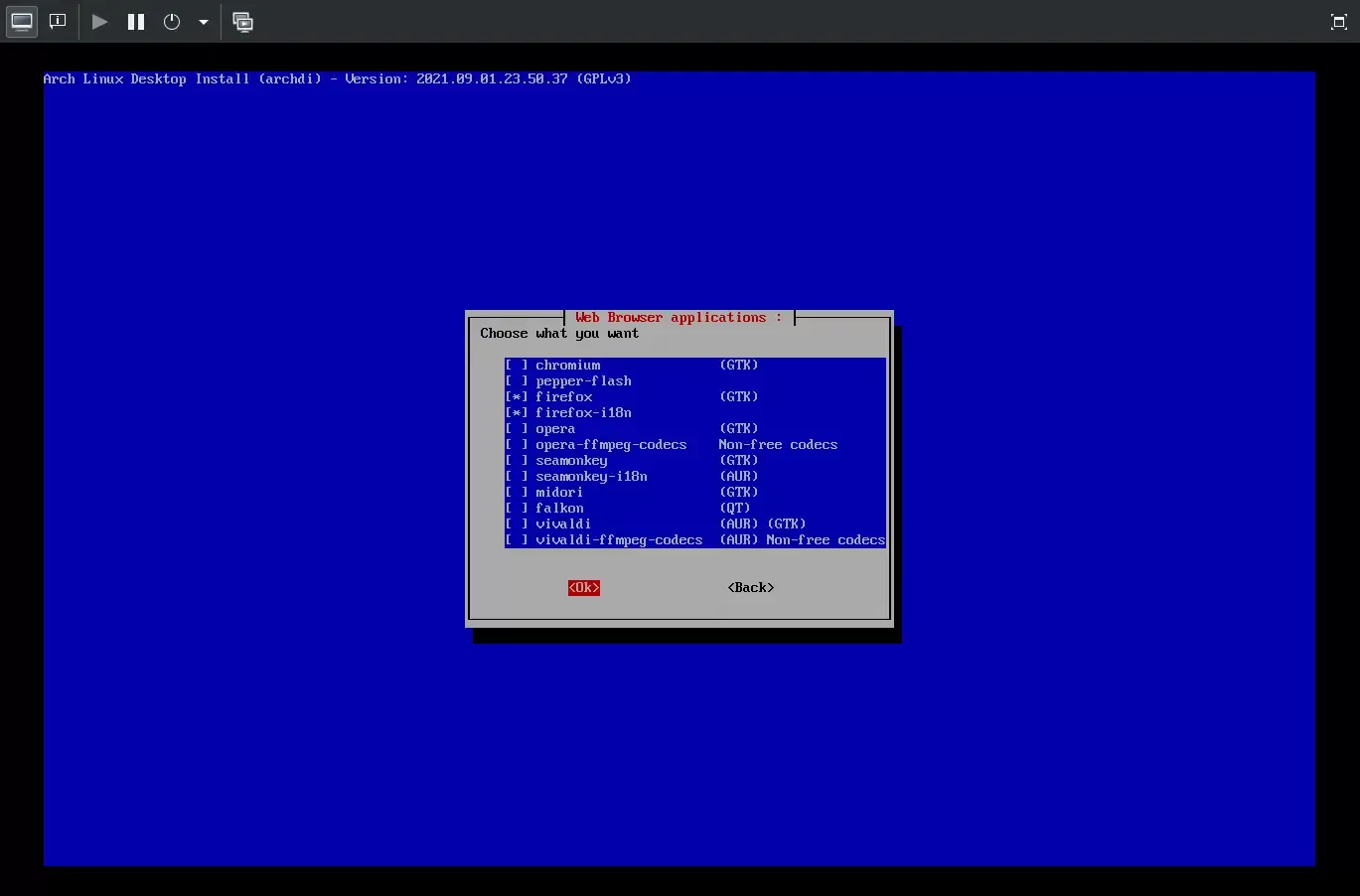 Рад АрчФи скрипте овде престаје, јер за инсталацију графичког окружења је неопходна друга скрипта са именом Archdi. Арчди скрипта има једноставнији главни мени са само три ставке, као на наредној слици: