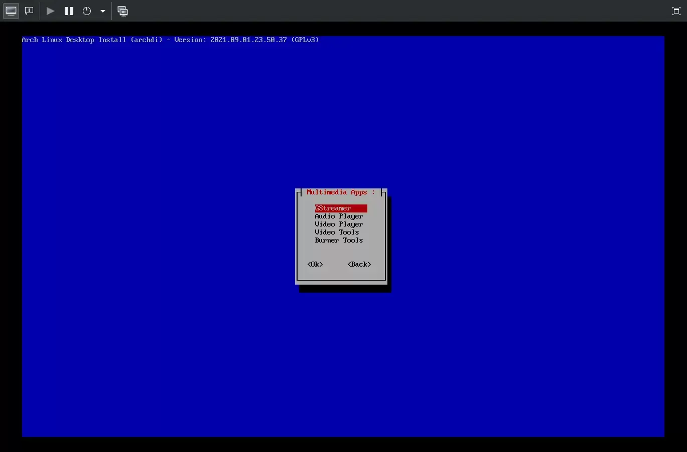Рад АрчФи скрипте овде престаје, јер за инсталацију графичког окружења је неопходна друга скрипта са именом Archdi. Арчди скрипта има једноставнији главни мени са само три ставке, као на наредној слици: