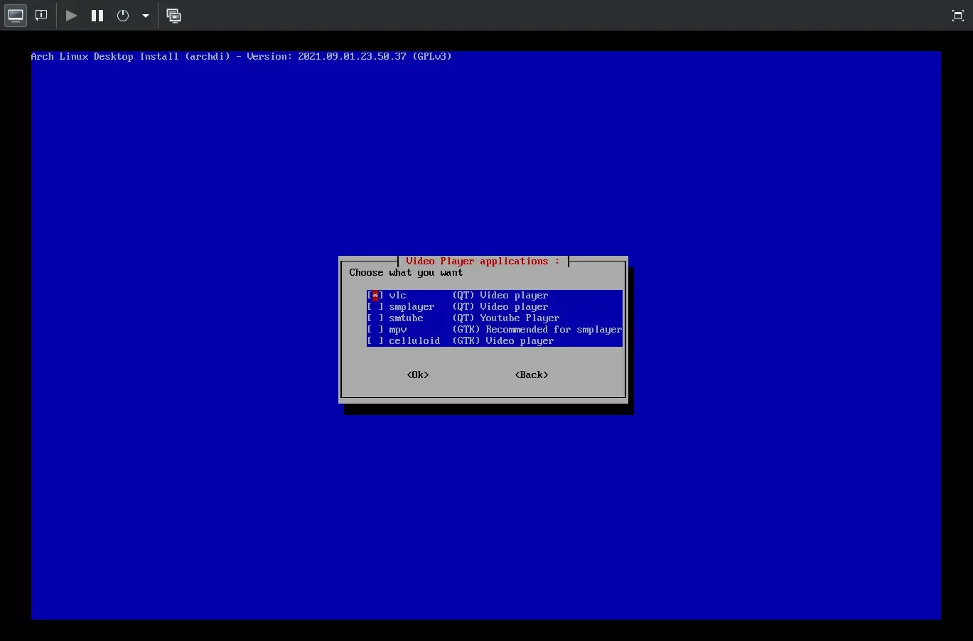 Рад АрчФи скрипте овде престаје, јер за инсталацију графичког окружења је неопходна друга скрипта са именом Archdi. Арчди скрипта има једноставнији главни мени са само три ставке, као на наредној слици: