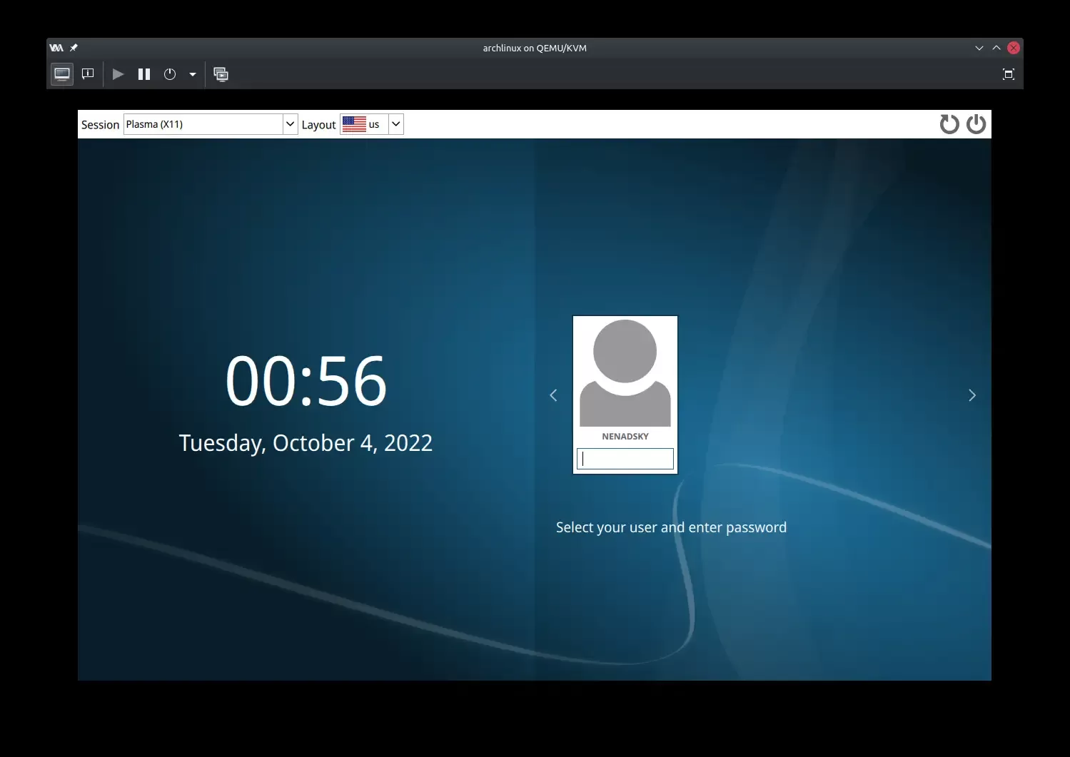 Након рестартовања система, пријављујете се у свеже инсталирани систем, са свим оним пакетима које сте путем Арчфи и Арчди скрипта инсталирали и подешавањима које сте начинили, а резултат овог примера у виртуелној машини можете видети на слици:
