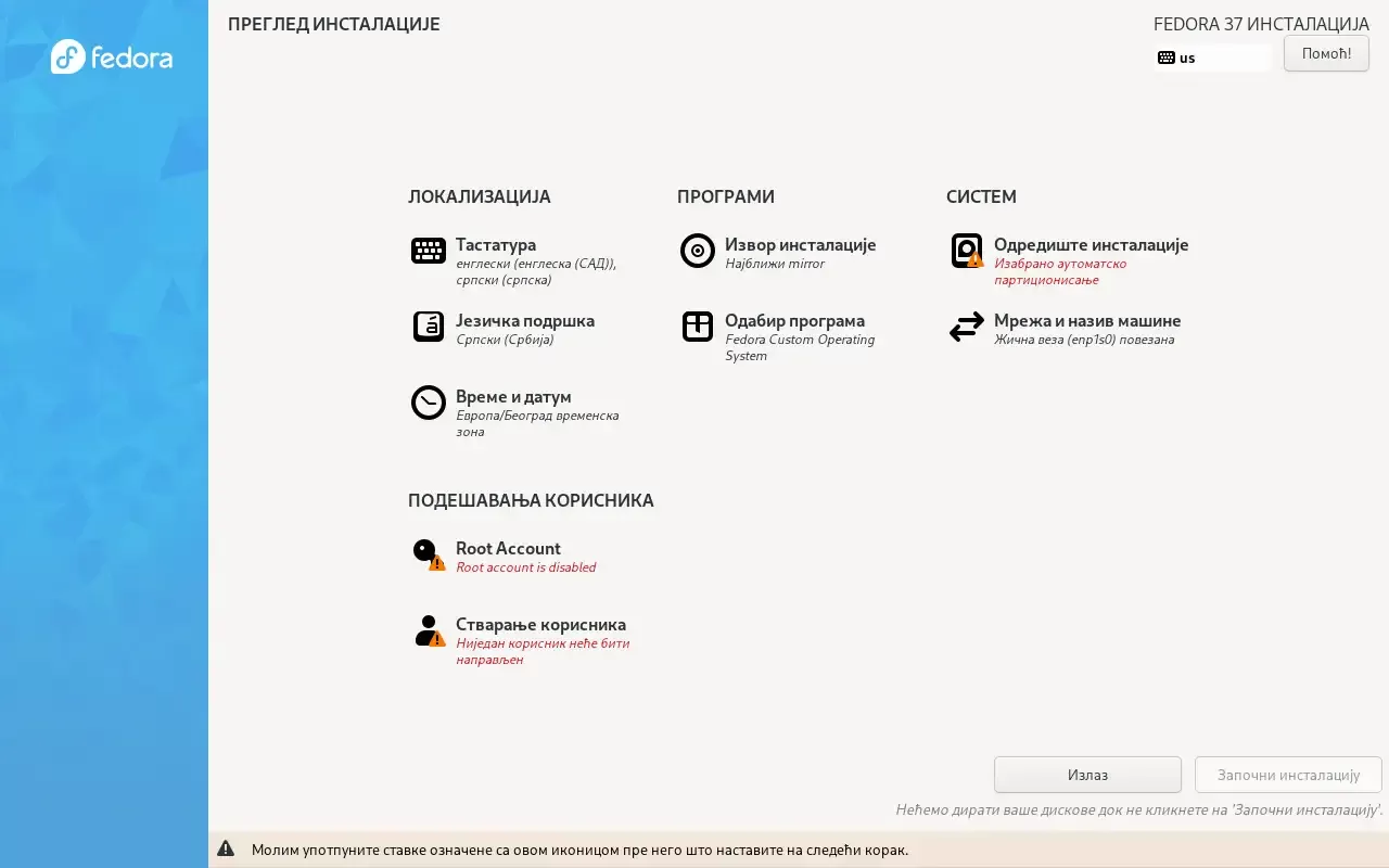 Пред сам крај инсталације могуће је подесити фајервол и додати жељеног корисника у sudoers групу како би имао администраторске привилегије коришћењем sudo команде. Скрипт омогућава и покретање одређених сервиса система, опет ово зависи од ваших потреба. Поново пита за инсталацију одређених кернела, што ме мало збуњује. Творац скрипта ваљда зна боље 🙂 Следи конфигурација бутлоадера, што и није неопходно.