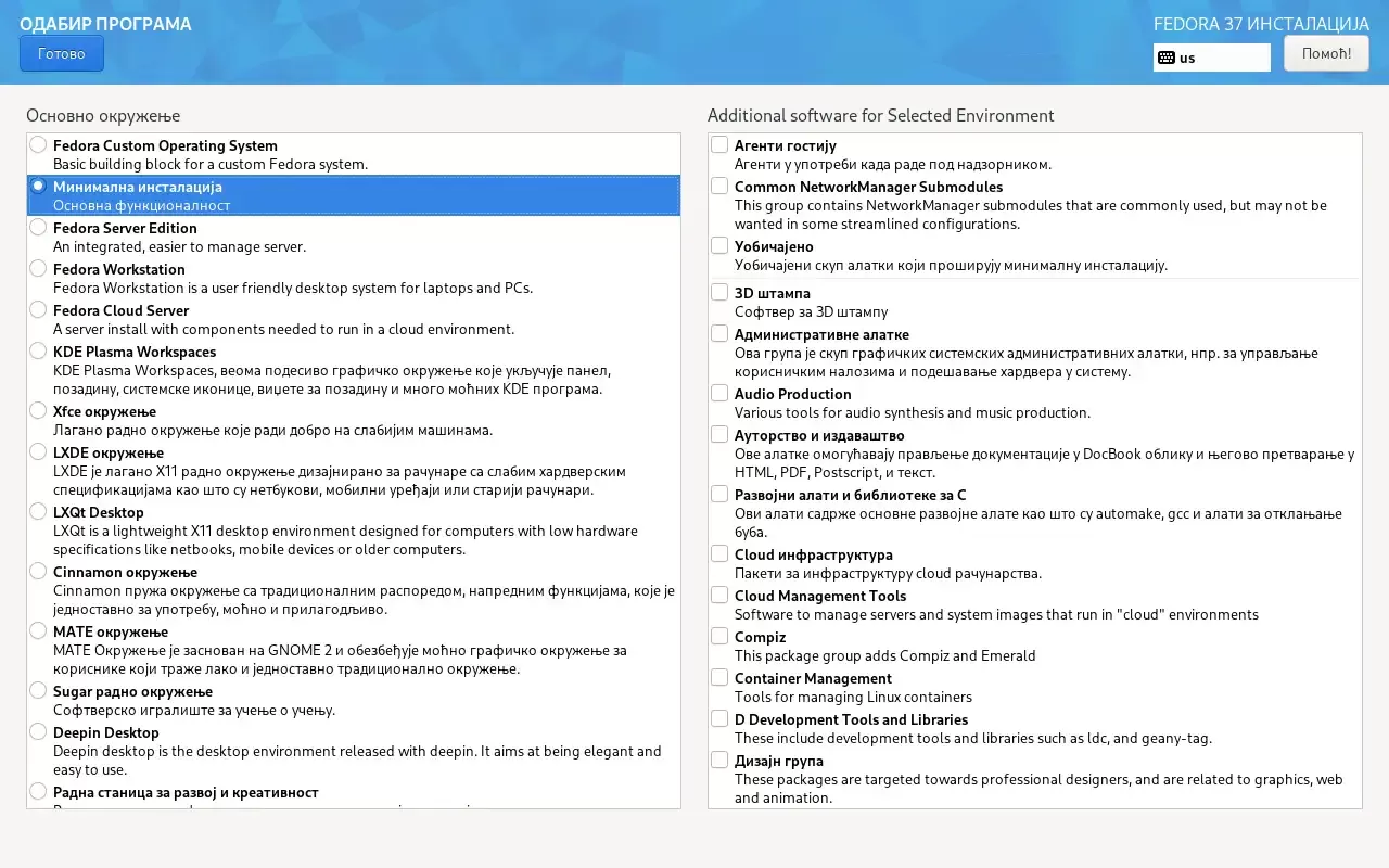 За крај ове области остала је инсталација графичког окружења и додатних апликација. Као корисник КДЕ Плазма окружења исто сам одабрао и за овај пример, са неким минималним сетом пакета Плазме и Плазма апликација. Од додатних апликација можете инсталирати канцеларијски пакет, Веб прегледник, клијент за торент, видео и аудио плејере, додатне кодеке… Све зависи од ваших жеља и потреба.