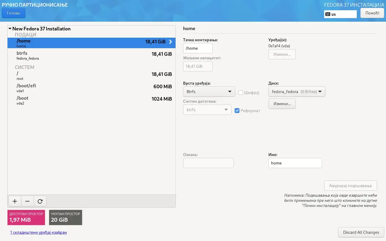 Напомена: Ова партициона шема је само за демонстративне сврхе. За реалну инсталацију и свакодневну употребу поред наведених партиција можете креирати swap и home партиције.